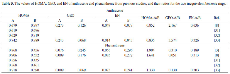 ![]() Figure 5. HOMA indices for the outer benzene ring (A) and central benzene ring (B) of the phenanthrene, along with the standard deviation values of bond length compared to the corresponding values from ref. 33.