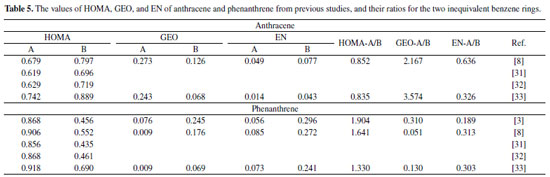 Inside the molecule, Both diatropic and paratropic currents are experimentally detectable by their contribution to chemical shifts. Theoretically, the assignment of aromaticity is investigated by visualizing the induced π-current density map through perturbation theory.10-15 The results for polycyclic aromatic hydrocarbon (PAH) molecules such as benzene, naphthalene, and anthracene show the flow of π-ring currents over the molecular perimeter, with weak diamagnetic π-vortices around the center of each ring and the midpoint of the C-C bond connecting them.11,13-14 This result agrees with the circuit model proposed by Pauling29 to account for the diamagnetic anisotropy of some aromatic molecules. Harmonic oscillator model of aromaticity (HOMA) Aromaticity has been the central concept in organic chemistry for a long time.19 One measure of aromaticity is structurally based-HOMA3,19 that was originally defined as ![]() where Ri is the ith bond length in the analyzed molecule's ring, n is the number of C-C bonds in the ring of the molecule, and α is a normalization factor making the unitless HOMA index equal to 1 for perfectly aromatic benzene and 0 for a perfectly alternating hypothetical Kekulé cyclohexatriene ring. Optimal bond length, Ropt, is the proper bond length for fully aromatic molecules and denotes the bond length for which expansion to the single bond and compression to the double bond requires the same energy.3 For carbocyclic molecules, the HOMA index defined in Eq. (12) can also be expressed as:3,20,21 ![]() with ![]() and ![]() where Rav is the average bond length for a ring of the molecule. Thus, two contributions to the HOMA index have been considered to mean the decrease in aromaticity of the π-electron system arising from independent mechanisms, i.e., (i) GEO as the degree of bond length alternation; and (ii) EN as the extension of the bonds over the mean bond length.3,20,21 For the C-C bond, using 1,3 butadiene as a reference (with Rs = 1.467 Å and Rd = 1.349 Å as reference bond lengths) one can obtain Ropt = 1.388 Å and α = 257.7 Å-2.3,20,21 Correction to Hückel parameters Correction to the Hückel method was performed because the carbon atoms at positions 11, 12, 13, 14 for anthracene have a different environment compared to those at other positions, and they are more electronegative compared to the others.18 Similarly, for phenanthrene, correction was performed for the carbons at positions 2, 5, 10, and 11. In addition, the π-ring current in anthracene and phenanthrene describes the π-current flow through the perimeter of the molecule.11,14,15,16,26 Two parameters were proposed to describe the change in the Coulomb energy of C11, C12, C13, and C14 of anthracene and C2, C5, C10, and C11 of phenanthrene: ![]() as well as the resonance energy between C11−C12 and C13−C14 of anthracene and C2−C11 and C5−C10 of phenanthrene, as ![]() In this case, for anthracene, the secular determinant equations for each irreducible representation of the Hückel matrix become: ![]() while for phenanthrene they become: ![]() The values of a and γ were varied within the range 0 < a < 1.0 and 0.1 < γ < 1.6, respectively. We note that a set value of a = 0 and γ = 1 refers to the original Hückel parameter. The bond length was calculated based on Eq. (11) to obtain the HOMA, GEO, and EN indices (Eq. (13)), and the ratio between the HOMA, GEO, and EN values between the benzene rings at the outer and center of the molecule. We note that applying Eq. (11) to estimate the bond length of benzene and naphthalene has resulted in a HOMA index of 1.000 and 0.910 for those two molecules, respectively, in good agreement with a previous study.25 For the HOMA index of anthracene, the results of previous studies show that the benzene ring at the center (B) of anthracene is more aromatic than the outer (A), opposite results to those of phenanthrene.8,30-33 Table 5 shows the HOMA, GEO, and EN values, as well as their ratios for the two inequivalent benzene rings of anthracene and phenanthrene from previous studies.