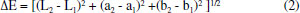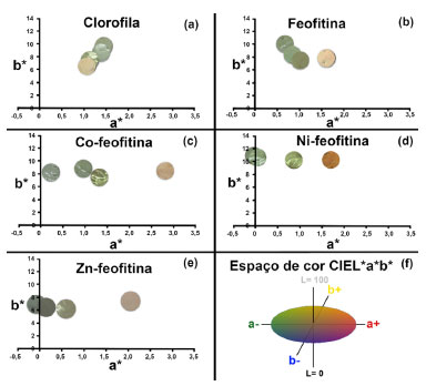 ![]() Figura 6. Deslocamento no espaço de cores CIE L*a*b* ao longo da exposição à luz para Clorofila (6a), Feofitina (6b), Co-feofitina (6c), Ni-feofitina (6d), Zn-feofitina (6e) e representação do espaço de cor (6f)