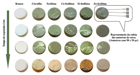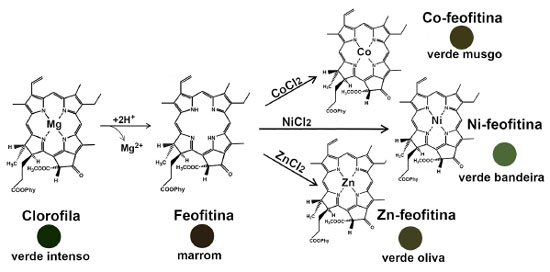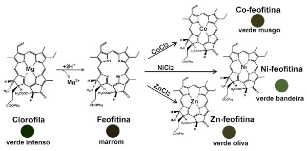 ![]() Figura 2. Transformações químicas promovidas na clorofila: 1º) acidificação para remoção do íon Mg2+ e formação de feofitina; 2º) combinação com sais cloreto para formar os complexos M-feofitina (M2+ = Co2+, Ni2+, Zn2+)