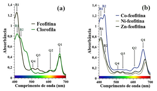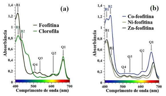 ![]() Figura 3. Espectros de absorção (VIS) dos extratos de clorofila e de feofitina (a); e dos complexos M-feofitina (b); destacando-se as bandas Soret (B1 e B2) e bandas Q (Q1, Q2, Q3 e Q4)