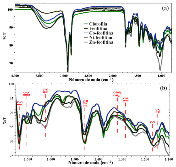 ![]() Figura 4. Espectros FTIR da clorofila, feofitina e complexos M-feofitina (3a); destacando as regiões entre 1750 cm-1 e 1100 cm-1 (3b)