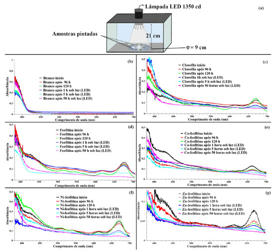 ![]() Figura 5. Aparato para teste de estabilidade à luz (5a); espectros eletrônico das amostras expostas a luz: branco (5b), clorofila (5c), feofitina (5d), Co-feofitina (5e), Ni-feofitina (5f), Zn-feofitina (5g)