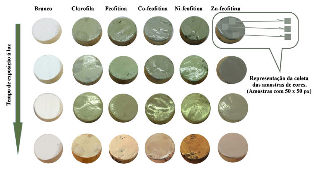 PARTE EXPERIMENTAL Materiais O resíduo do processamento da erva-mate foi coletado em indústria na região da cidade de Guarapuava, Paraná-Brasil, e armazenadas ao abrigo da luz e sob refrigeração (-15 oC). O etanol utilizado foi adquirido em posto de combustível, filtrado em papel filtro (45 µm) para retirada de eventuais particulados. Foram utilizados os seguintes reagentes: ácido clorídrico (HCl, 37%, grau P.A., Labsynth®, Brasil), cloreto de cobalto (II) hexa-hidratado (CoCl2·6H2O, grau P.A., Neon, Brasil), cloreto de níquel (II) hexa-hidratado (NiCl2·6H2O, grau P.A., Neon, Brasil), cloreto de zinco (II) penta-hidratado (ZnCl2·5H2O, grau P.A., Neon, Brasil). Preparação da resina e extração da clorofila A resina retirada dos equipamentos de processamento da erva-mate foi recebida em pedaços medindo cerca de 10 cm x 5 cm, de cor verde oliva, com odor característico de erva-mate; foi fragmentada com o uso de utensilio cortante (tipo faca), e triturada em moinho tipo Willye (Tecnal Equipamentos Científicos, modelo TE-650) até ficar totalmente pulverizada e com granulometria uniforme (< 1 mm). Em seguida o pó foi seco em estufa (60 oC por 24 h). A extração foi realizada em extrator Soxhlet, utilizando 25 g de resina em pó, e 250 mL de etanol por cerca de 3 horas, totalizando 12 ciclos de refluxo. O extrato etanólico verde foi monitorado em um espectrofotômetro de absorção (Visível) para confirmação da presença de clorofila. Síntese de metal-feofitina Em um béquer, foram colocados, sob agitação, 200 mL do extrato etanólico contendo clorofila e gotejados 84 µL de ácido clorídrico (10-5 mol de HCl) levando à formação da feofitina, evidenciada pela percepção visual da mudança da cor da solução de verde para marrom e monitorado em espectrofotômetro de absorção (Visível). Alíquotas de 50 mL foram separadas para a complexação com os íons cobalto (II), níquel (II) ou zinco (II). Para a síntese de metal-feofitina, cada alíquota foi aquecida, em balão de fundo redondo acoplado a um condensador de refluxo, até a ebulição, seguida pela adição gota-a-gota de 2,5 mL de solução etanólica (0,2 mol L-1) do respectivo sal cloreto (CoCl2, NiCl2 ou ZnCl2), e mantida sob ebulição por 20 minutos. As soluções foram armazenadas sob refrigeração (8 oC) e ao abrigo de luz. Análises dos extratos Os extratos etanólicos foram caracterizados por espectroscopia eletrônica de absorção na região do visível (Visível) em um espectrofotômetro marca Shimadzu, modelo UV-1800; por espectroscopia vibracional na região do infravermelho por transformada de Fourier (FTIR), em espectrofotômetro marca Perkin Elmer, modelo Frontier. Analise química por energia dispersiva de fluorescência de raios X (EDXRF) em espectrofotômetro Shimadzu, modelo EDX-7000. Análise de cor pela decomposição em tons de cinza e classificação das amostras por Random Forest (RF). Aplicação dos extratos Os extratos etanólicos das amostras (clorofila, feofitina, Co-feofitina, Ni-feofitina, Zn-feofitina) foram secos por evaporação à temperatura entre 60 oC a 65 oC, obtendo os pigmentos em pó. Os pigmentos foram dispersos em tinta esmalte sintético branco (marca Madeiras e Metais Coralar, Coral AkzoNobel) na proporção de 10% em massa. A tinta pigmentada foi aplicada em discos de madeira para análise.