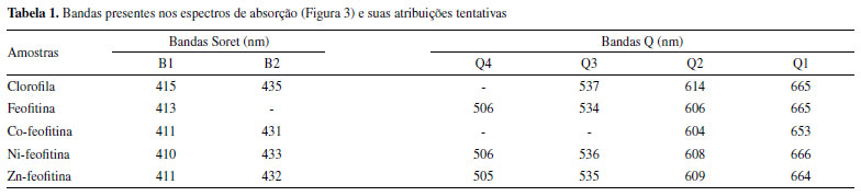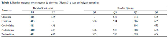 Espectroscopia eletrônica (visível) Os espectros eletrônicos de absorção na região do visível para os extratos da clorofila e da feofitina são mostrados na Figura 3a. Foi observado as bandas Soret (B1 e B2) entre 400-500 nm e as bandas Q (Q1, Q2, Q3 e Q4) entre 500-700 nm. Para a clorofila a presença do íon Mg2+ coordenado no macrocíclico tetrapirrólico apresenta maior simetria (D4h) do que o macrocíclico feofitina (D2h) e, consequentemente, uma simplificação no padrão dessas bandas.30 No espectro da feofitina a saída do íon Mg2+ provoca um deslocamento hipsocrômico (para o azul) da banda Soret, conforme sumarizado na Tabela 1. Os espectros de absorção dos complexos M-feofitina (Co-feofitina, Ni-feofitina e Zn-feofitina) são apresentados na Figura 3b e sumarizados na Tabela 1.