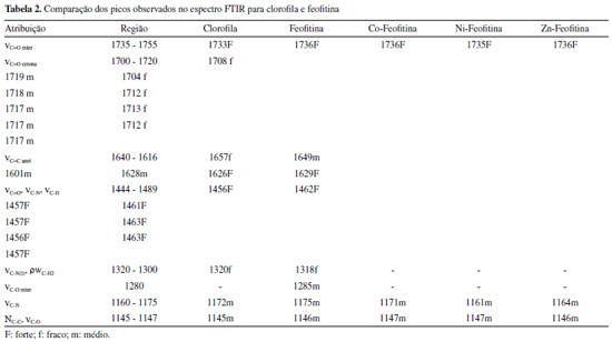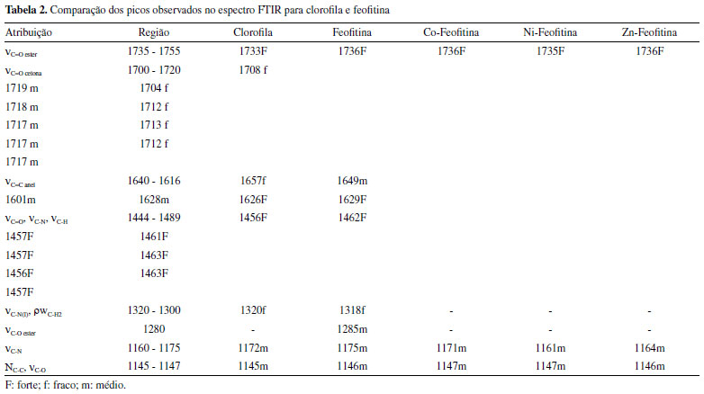 Durante o processo de extração, além da clorofila a se extrai também frações de clorofila b e de pigmentos carotenoides.11,15,19 As bandas de absorção (B1 e B2) do espectro da clorofila são referentes às clorofilas a e b, respectivamente.11-14,31 A banda situada em 470 nm no espectro da clorofila (Figura 3a) é atribuída à presença de moléculas de carotenoides.15,32 As amostras apresentaram bandas de absorção na região do violeta e azul (banda Soret) e na região do amarelo e vermelho (bandas Q). Os deslocamentos hipsocrômicos das bandas Q nas M-feofitinas (Co2+, Ni2+, Zn2+) têm sido relatadas na literatura.32,33 Cada íon metálico central possui diferentes energias de ligação com o macrocíclico; sendo a mais fraca na Mg-clorofila (interação eletrostática), aumentando de intensidade no complexo Zn-feofitina (ligação covalente coordenada), e fortes interações covalentes de coordenação nos complexos Co-feofitina e Ni-feofitina.34 De acordo com energia de estabilização do campo cristalino (EECC), e considerando o raio iônico, observa-se que Ni2+ (d8) apresenta maior estabilidade (EECC = -1,2 Dq ou 6/5 Δo) e menor raio iônico (0,070 nm), enquanto Zn2+ (d10) apresenta estabilidade nula (EECC = 0) e maior raio iônico (0,075 nm).35 O íon Co2+ (d7) situa-se em posição intermediária, tanto em relação ao raio iônico (0,074 nm) quanto à estabilidade (EECC = -0,8 Dq ou 4/5 Δo). Dessa forma, e sob o ponto de vista da EECC e raio iônico, é esperado que os complexos M-feofitina apresentem também diferenças nos espectros eletrônicos. A EECC do complexo Zn-feofitina deixa o espectro eletrônico próximo do espectro da feofitina, com pequeno deslocamento hipsocrômico das bandas Q e Soret. O íon Zn2+ apresenta configuração eletrônica de camada cheia (d10), e se comporta como sistema simétrico e apresenta um único estado de energia. Na comparação dos espectros entre Zn-feofitina e Ni-feofitina, as diferenças são mais perceptíveis na banda Q em 664-666 nm, com pequeno deslocamento da banda do espectro da Ni-feofitina para o vermelho, que pode estar relacionado à menor carga residual do Ni2+, que geralmente têm menor afinidade por ligantes adicionais.30 O complexo Co-feofitina apresenta espectro de absorção com 2 bandas Q, influência da configuração d7 do íon Co2+, que na presença de ligantes de campo forte ocorre um desdobramento do orbital x2-y2 para região de mais alta energia, ficando à disposição para interagir com os ligantes. Isso explica os deslocamentos hipsocrômicos e o alargamento das bandas do espectro da Co-feofitina.35,36 Espectroscopia no infravermelho (FTIR) Os espectros vibracionais na região do infravermelho são mostrados na Figura 4a. As principais mudanças nas estruturas da clorofila e feofitina ocorrem na região entre 1750 cm-1 e 1100 cm-1 (Figura 3b).37 Na Tabela 2 estão relacionadas as posições das bandas (número de onda) que caracterizam cada composto, acompanhadas das atribuições forte (F), médio (m) ou fraco (f).