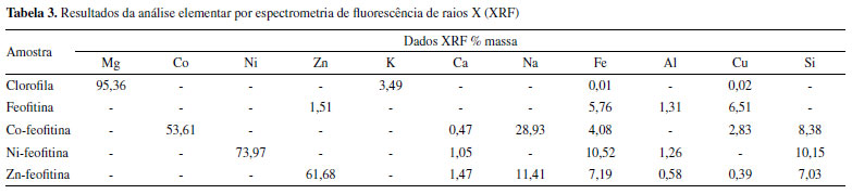 As bandas na região entre 1700 - 1755 cm-1 referem-se as vibrações relacionadas com as ligações C=O de esteres e cetonas de compostos neutros. Clorofila e feofitina apresentam bandas fortes em 1733 cm-1 e 1736 cm-1, bandas fracas em 1708 cm-1 e 1704 cm-1, respectivamente. Na banda de maior intensidade da feofitina ocorre um deslocamento para a região de maior energia em relação à clorofila. Os modos vibracionais dos anéis pirrólicos aparecem como bandas nas regiões de: 1616 - 1640 cm-1 (C=C); 1510 1580 cm-1 (N-H anel II na feofitina); 1300 - 1320 cm-1 (C-N anel III); 1444 1489 cm-1 (C=O, C-N, C-H) do anel isocíclico anexo ao anel pirrólico III. A banda da clorofila em 1657 cm-1 está presente na feofitina em 1601 cm-1, e uma segunda banda em 1649 cm-1. Em 1550 cm-1; 1515 cm-1 e 1320 cm-1, as bandas apresentam, respectivamente, sinais médio, fraco e fraco, o sinal da feofitina deslocou-se para região de mais baixa energia em relação à clorofila. Pode-se concluir com base nas informações anteriores que o núcleo porfirínico da feofitina apresenta maior estabilidade em relação à clorofila. Isso é percebido pela tendência da feofitina apresentar modos vibracionais em regiões de maior energia (maior número de onda) que a clorofila. No caso das M-feofitina, todas apresentam bandas em regiões de baixa energia em relação à feofitina base livre. Entre 1616 1640 cm-1 (C=C anéis) as bandas da Co-feofitina são distintas das demais M-feofitina. Este fato é um indicativo dos diferentes modos de coordenação desses complexos. O Ni(II) tende a se encaixar dentro do sistema de anéis formando um composto planar; o Zn(II) tende a atrair mais um ligante formando um complexo com estrutura piramidal quadrada; e o Co(II) é capaz de formar estrutura octaédrica distorcida que interfere nas vibrações do macrocíclico.30 Clorofila e feofitina apresentaram bandas fracas na região entre 1320 1300 cm-1, e nas M-feofitina as bandas são muito fracas. Na região entre 1160 1175 cm-1, relacionada às vibrações C-N do anel, novamente a feofitina apresenta modos vibracionais em regiões de maior energia (maior número de onda) que a clorofila. Para as M-feofitina os modos vibracionais aumentam de energia no sentido Ni-feofitina < Zn-feofitina < Co-feofitina, coincidindo com a crescente complexidade estrutural planar < piramidal < octaédrica. Espectrometria de fluorescência de raios X (XRF) A Tabela 3 resume os resultados da análise química por energia dispersiva de fluorescência de raios X (EDXRF) obtidos para amostras em pó. O magnésio foi encontrado somente na amostra de clorofila; a sua ausência na feofitina é um indicativo que o processo de remoção do íon Mg2+ foi bem-sucedido. Desta forma, a presença dos elementos cobalto, níquel e zinco encontrados na respectiva M-feofitina, indica que ocorreu a metalação conforme proposto. Por outro lado, alguns elementos minoritários foram encontrados, atribuído ao fato da matéria-prima ser de origem vegetal e não ter passado por nenhum processo de purificação. A porcentagem de magnésio e os demais elementos encontrados na clorofila são compatíveis com outros trabalhos descritos na literatura.17