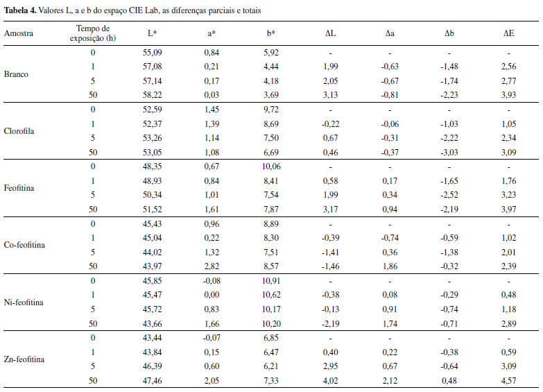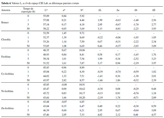 O teste foi monitorado por medidas de espectros no visível e colorimetria, nos seguintes intervalos de tempo: recém pintado; ao abrigo da luz por 96 horas e 120 horas; e exposto a luz de LED após 1 hora; 5 horas e 50 horas. O aparato para fotoestabilidade consiste em uma caixa de polipropileno opaco, em cuja tampa foi adaptada uma lâmpada LED. As especificações da lâmpada e a distância das amostras permite calcular a iluminância incidente nas amostras. A relação entre intensidade luminosa (I) e iluminância (E) é dada pela equação (1).38 ![]() em que E é a iluminância em lux (lx); I é a intensidade luminosa em candela (cd); r é a distância da fonte de luz em metros (m); θ é o ângulo de inclinação da lâmpada (neste caso igual a zero). Aplicando os valores na equação 1: ![]() Considerando como tempo de exposição de 50 horas, a dose total de iluminância recebida pelas amostras foi de 1.530 klux (50 h x 30,6 klux). Considerando que um ambiente interno com incidência de 10 horas/dia de luz, iluminado por cerca de 200 lux conclui-se que essa dose representou cerca de 765 dias ininterruptos de exposição em ambiente interno.38,39 A Figura 5 (b-g) mostra os espectros eletrônicos em função do tempo de exposição. Para branco (Figura 5 b), os espectros se mantiveram relativamente estáveis; as amostras contendo pigmento apresentaram uma diminuição gradual da intensidade das bandas Q e Soret, até sua total extinção em função do tempo de exposição à luz (Figura 5 c-g). O desaparecimento das bandas é um indicativo de decomposição química dos pigmentos, especialmente do anel macrocíclico, responsável pela formação das bandas Q e Soret. A diminuição da intensidade das bandas Q e Soret foi seguida de mudanças na cor das amostras. As diferenças nas cores das amostras foram medidas em colorímetro portátil (Tecnal Equipamentos, modelo NR60CP-3nh) no espaço de cor CIE L*a*b* (Tabela 4). As medidas de L* variam de 0 (preto) à 100 (branco), a* do verde ao vermelho, e b* do amarelo ao azul (Figura 6f).40 Os valores medidos de L* estão todos na região positiva e mais clara do espaço de cor (Figura 6). Com o tempo de exposição à luz, os pigmentos Co feofitina e Ni-feofitina tiveram uma pequena diminuição do valor de L*, indicando escurecimento da tinta, enquanto os pigmentos Clorofila, Feofitina e Zn-feofitina tiveram aumento dos valores de L*, indicando um clareamento da superfície. As medidas do parâmetro a* apresentam tendência de tons de cinza, próximas do centro para todas as amostras; e com o tempo de exposição à luz os valores foram deslocados no sentido do verde para o vermelho. De forma similar, os valores de b* para todas as amostras foram deslocadas do amarelo em direção à região do azul (Figura 6).
