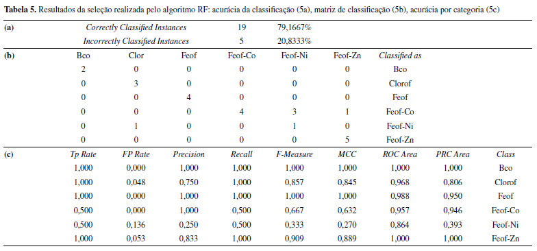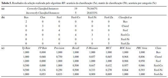 O software WEKA foi utilizado para construção e validação dos modelos de classificação utilizando-se o algoritmo Random Forest. Assim, 66,67% das 72 amostras destacadas foram selecionadas para a construção do modelo de classificação. Os 33,33% restante das amostras foram utilizados para a validação do modelo. Utilizou-se o Cross-validation para visualizar qual parâmetro da rede é mais adequado para a classificação. Sendo que 48 amostras selecionadas (66,67%), 10% foram utilizadas para construir o modelo e 90% foram utilizadas para fazer a validação. O processo dessa validação interna demonstrou que 72% das amostras foram corretamente classificadas indicando que o modelo por Cross-validation foi adequado para classificação das amostras. Após a geração do modelo por Cross-validation, o modelo com conjunto total de dados (66,67% das amostras) foi rodado no software WEKA. Essa classificação ocorreu com 100% de acerto para a classificação das amostras. Por fim, foi rodada a validação externa do modelo de classificação com as 24 amostras restantes (33,33% das amostras), resultando em acurácia de 79,17%. Apenas 5 amostras das 24 utilizadas para esse modelo foram incorretamente classificadas. Os resultados das classificações das amostras, matriz de confusão e taxas de acertos do modelo final são apresentados na Tabela 5.