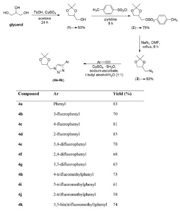 MATERIALS AND METHODS Generalities The solvents, CuSO4·5H2O, sodium ascorbate, sodium azide, p-toluene sulphonic acid, and pyridine were purchased from Vetec (Rio de Janeiro, Brazil) and used as received. The terminal alkynes and p-toluenesulfonyl chloride were procured from Sigma-Aldrich (St. Louis, MO, USA) and used as received from the commercial supplier. The reaction progress was monitored by thin layer chromatography (TLC). Analytical thin layer chromatography analysis was conducted on aluminum backed precoated silica gel plates using different solvent systems. TLC plates were visualized using potassium permanganate solution, phosphomolybdic acid solution, and/or UV light. Column chromatography was performed using silica gel 60 (60-230 mesh). The IR spectra were acquired using a Tensor 27 device (Bruker, Karlsruhe, Germany) and the attenuated total reflection (ATR) technique scanning from 500 to 4000 cm-1. The 1H and 13C NMR spectra were recorded on a Varian Mercury 400 instrument (Varian, Palo Alto, CA, USA), at 400 MHz for 1H and 100 MHz for 13C, using CDCl3 as deuterated solvent and TMS as internal standard. Mass spectra were recorded on a GCMS-QPPlus 2010 device (Shimadzu, Kyoto, Japan) under electron impact (70 eV) condition of positive ion mode. Melting points were determined with MA 381 equipment (Marconi, São Paulo, Brazil) and are uncorrected. The 1H NMR data are presented as follows: chemical shift (δ) in ppm, multiplicity, the number of hydrogens, and J values in Hertz (Hz). Multiplicities are indicated by the following abbreviations: s (singlet), d (doublet), dap (apparent doublet), dd (double of doublets), td (triplet of doublets), tdd (triplet of double of doublets), t (triplet), tap (apparent triplet), tt (triplet of triplets), quartet, and m (multiplet). Synthetic procedures Preparation of compounds 1, 2, and 3 The intermediate compounds (2,2-dimethyl-1,3-dioxolan-4-yl) methanol (1), (2,2-dimethyl-1,3-dioxolan-4-yl)methyl-4-methyl benzenesulfonate (2), and 4-(azidomethyl)-2,2-dimethyl-1,3-dioxolane (3) were synthesized as previously reported by our research group.21,22 General procedure for the synthesis of compounds 4a-4k The following general procedure was utilized in the preparation of derivatives 4a-4k. A round-bottomed flask was charged with azide 3 (1.50 equivalent), terminal alkyne (1.00 equivalent), aqueous solution of CuSO4·5H2O (0.100 mol L-1, 1.00 mL, 0.0960 mmol), sodium ascorbate (0.0600 g, 0.288 mmol) and aqueous solution of tert-butyl alcohol (1:1 v v-1, 12.0 mL). The resulting reaction mixture was stirred at 50 °C for 8 h. After the completion of the reaction, as verified by TLC analysis, distilled water (10.0 mL) was added and the aqueous phase was extracted with dichloromethane (3 × 20.0 mL). The organic extracts were combined and the resulting organic layer was dried over anhydrous sodium sulfate, filtered, and concentrated under reduced pressure. The crude products were purified by silica gel column chromatography eluted with ethyl acetate-methanol (9:1 v v-1). The structures of compounds 4a-4k are supported by the following data. Synthesis of 1-((2,2-dimethyl-1,3-dioxolan-4-yl)methyl)-4-phenyl-1H-1,2,3-triazole (4a) White solid, prepared in 83% yield from the reaction between phenylacetylene (1.50 g, 14.7 mmol) and azide 3 (1.50 g, 9.60 mmol), m.p.120-123 °C. TLC: Rf = 0.57 (diethyl ether-dichloromethane, 10:1 v v-1). IR (ATR) -ν/cm-1: 3145, 2992, 2923, 2853, 1607, 1484, 1461, 1438, 1373, 1262, 1224, 1202, 1166, 1115, 1063, 1041, 970, 883, 833, 767, 699. 1H NMR (400 MHz, CDCl3) δ: 1.32 (s, 3H, CH3'), 1.36 (s, 3H, CH3''), 3.74 (dd, 1H, J1 = 8.8 Hz and J2 = 6.0 Hz, Ha-11), 4.09 (dd, 1H, J1 = 8.8 Hz and J2 = 6.4 Hz, Hb-11), 4.40-4.50 (m, 2H, Ha-9/H-10), 4.55 (dd, 1H, J1 = 12.8 Hz and J2 = 2.8, Hb-9), 7.29 (tt, 1H, J1 = 8.0 Hz and J2 = 1.2 Hz, H-4), 7.37-7.41 (m, 2H, H-3/H-5), 7.80 (dd, 2H, J1 = 8.0 Hz and J2 = 1.2 Hz, H-2/H-6), 7.87 (s, 1H, H-8). 13C NMR (100 MHz, CDCl3) δ: 25.1(CH3'), 26.6 (CH3''), 52.2 (C-9), 66.3 (C-11), 74.0 (C-10), 110.2 (C-12), 120.9 (C-8), 125.6 (C-2/C-6), 128.0 (C-4), 128.8 (C-3/C-5), 130.5 (C-1), 147.7 (C-7). MS (m/z, %): 259 ([M]+, 19), 244 ([M-15]+, 16), 144 (18), 127 (18), 116 (25), 99 (33), 85 (56), 71 (70), 57 (100), 43 (79), 41 (29), 32 (11). Synthesis of 1-((2,2-dimethyl-1,3-dioxolan-4-yl)methyl)-4 (3 fluorophenyl)-1H-1,2,3-triazole (4b) White solid, prepared in 70% yield, from the reaction between 1-ethynyl-3-fluorobenzene (1.70 g, 14.2 mmol) and azide 3 (1.50 g, 9.60 mmol), m.p. 88-91 °C. TLC: Rf = 0.60 (diethyl ether-dichloromethane, 10:1 v v-1); IR (ATR) -ν/cm-1: 3099, 2992, 1620, 1590, 1484, 1465, 1444, 1372, 1293, 1225, 1202, 1149, 1115, 1055, 1026, 969, 865, 835, 755, 687. 1H NMR (400 MHz, CDCl3) δ: 1.33 (s, 3H, CH3'), 1.38 (s, 3H, CH3''), 3.75 (dd, 1H, J1 = 8.8 Hz and J2 = 6.0 Hz, Ha-11), 4.12 (dd, 1H, J1 = 8.8 Hz and J2 = 6.4 Hz, Hb-11), 4.42-4.51 (m, 2H, Ha-9/H-10), 4.58 (dd, 1H, J1 = 12.6 Hz and J2 = 2.6, Hb-9), 6.99 (tdd, 1H, J1 = 8.5 Hz, J2 = 2.5 Hz and J3 = 0.8 Hz, H-4), 7.33-7.38 (m, 1H, H-6), 7.51-7.59 (m, 2H, H-2/H-5), 7.90 (s, 1H, H-8). 13C NMR (100 MHz, CDCl3) δ: 25.1 (CH3'), 26.6 (CH3''), 52.3 (C-9), 66.3 (C-11), 74.0 (C-10), 110.2 (C-12), 112.6 (d, JC-F = 22.0 Hz, C-2), 114.9 (d, JC-F = 21.0 Hz, C-4), 121.2 (d, JC-F = 3.0 Hz, C-6), 121.3 (C-8), 130.3 (d, JC-F = 8.0 Hz, C-5), 132.6 (d, JC-F = 9.0 Hz, C-1), 146.6 (d, JC-F = 3.0 Hz, C-7), 163.1 (d, JC-F = 253.0 Hz, C-3). MS (m/z, %): 277 ([M]+, 34), 262 ([M-15]+, 32), 248 (10), 219 (21), 206 (11), 190 (10), 177 (9), 162 (37), 148 (28), 134 (40), 120 (24), 101 (33), 83 (10), 73 (20), 57 (44), 43 (100), 41 (48), 31 (10). Synthesis of 1-((2,2-dimethyl-1,3-dioxolan-4-yl)methyl)-4-(4-fluorophenyl)-1H-1,2,3-triazole (4c) White solid, prepared in 81% yield from the reaction between 1-ethynyl-4-fluorobenzene (2.00 g, 16.7 mmol) and azide 3 (1.75 g, 11.1 mmol), m.p. 100-103 °C. TLC: Rf = 0.57 (diethyl ether-dichloromethane, 10:1 v v-1); IR (A