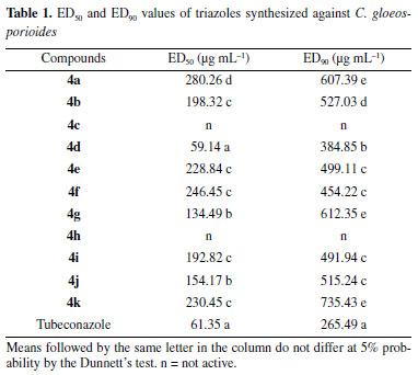 SUPPLEMENTARY MATERIAL The regression equations used in the calculation of ED50 and ED90 values of triazoles synthesized against C. gloeosporioides and some selected IR, 1H and 13C NMR, and MS spectra are freely available at http://quimicanova.sbq.org.br, in pdf format.