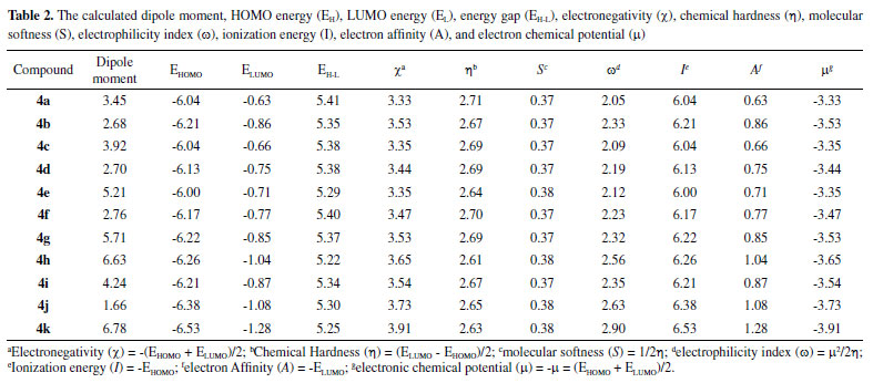 As described by Berredjem and co-workers,46 the energy of HOMO and LUMO frontier orbitals are useful for the calculation of other physical chemical properties, namely, dipole moment, ionization energy (I), electron affinity (A), electronegativity (χ), electronic chemical potential (µ), chemical hardness (η), electrophilicity index, and molecular softness (S).47-50 Thus, based on the energy levels of the frontier orbital pairs of compounds 4a-4k, the aforementioned properties were determined and the calculated values are depicted in Table 2. Eletronegativity (χ) is a measure of the power of an atom to attract electrons (or electron density) towards itself when forming chemical bonds.51 The chemical hardness (η) can be defined as the measure of the resistance to change in the electron distribution in a collection of nuclei and electrons.47 Softness (S) is just the reciprocal of chemical hardness.52 The electrophilicity index (ω) is considered to be a measure of electrophilic power.53 The compounds 4h (presenting one CF3 group at the para position of the aromatic benzene ring) and 4k (with two CF3 groups also attached to the aromatic benzene ring) displayed the highest dipole moments (6.63 for 4h and 6.78 for 4k). The derivatives 4k and 4a exhibited the highest and the lowest χ values, respectively. The charge transfer resistance estimated from global hardness values (η) showed no great variation (2.61-2.71) among the compounds analyzed. The electronic acceptability of a molecule is ascribed to the global softness (S). Since the molecules do not significantly differ in terms of functional groups, there was no significant difference in this parameter (0.37-0.38). The energy reduction resulted from the electron flow from HOMO (donor) to LUMO (acceptor) is associated with the electrophilicity index (ω).54 Electrophilicity is a fundamental property of organic compounds, which involves some adequate information regarding structure, reactivity, aromaticity, and toxicity, etc.55 The compound 4k showed the highest electrophilicity value (2.90). Log P, previously employed to analyze the assimilation capacity of oral usage drugs,56 can also be used to determine the bioavailability of a given organic compound for a plant, as described by Tice,57 after the fitting of those parameters to the herbicidal and insecticidal activity requirements, and the addition of a new parameter (number of rotatable bonds). The optimal values of those parameters proposed by Tice are: H-bond donors ≤ 3; H-bond acceptors ≥ 2 and ≤ 12; molecular weight ≥ 150 and ≤ 500; cLogP ≤ 4; rotatable bonds ≤ 12. These studies have been greatly influential as they provide useful clues for agrochemical development based on physico-chemical parameters, which are easy to calculate. The parameters are summarized in Table 3 for all the obtained derivatives.