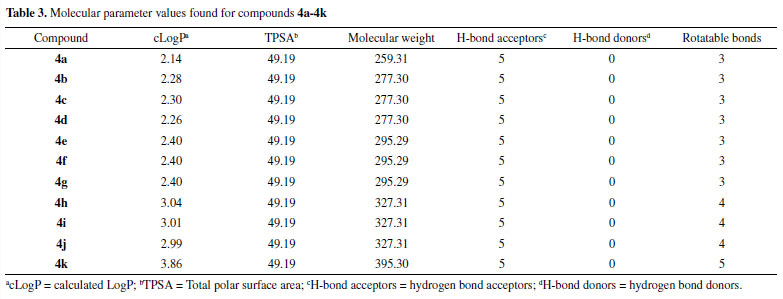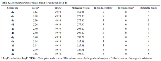 All tested compounds did fit the rule, as they have cLog P values < 4 (2.14 - 3.86), which agrees with Tice requirements. Besides, none of the compounds exceeded the number of rotatable bonds (3-5), H-bond donors (0), or H-bond acceptors (5). It should be noticed that we did not find plain correlations between the calculated physico-chemical parameters herein described and the fungicidal activity. However, as previously mentioned, the knowledge of physico-chemical parameters of bioactive compounds is an important knowledge in the research and development of agrochemicals and pharmaceuticals. In a recent study, Ogaha and co-workers analyzed the contribution that organofluorine compounds make to the agrochemical industry.58 They undertook the task of analyzing 424 fluorine-containg agrochemicals. Among several investigated features of the set of compounds is the distribution of these agrochemicals by molecular weight and LogP. It was found that 57% of herbicides and 55% of fungicides present molecular weight within the 300 to 400 Da range. The compounds 4h-4k have molecular weights within this interval, while the compounds 4a-4g have molecular weights < 300. In the investigation of Ogaha and co-workers, the compounds presenting molecular weight below 300 corresponded to 9% of herbicides. Concerning the calculated Log P and CLop, 52% of herbicides and 67% of fungicides displayed both LopP and CLogP values inside the 3 to 5 interval. In the present study, the most active compounds 4h, 4i, and 4k has the CLogP within this range, while the remaining compounds have CLogP < 3. Still regarding Ogawa and collaborators' report, 32% of herbicides and 10% of fungicides have CLogP lower than 3.