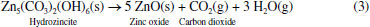 X-Ray diffraction pattern Figure 3 shows the X-ray diffraction pattern (XRDP) of the ZnO NPs precursor. The XRDP of the precursor material shows the major characteristic signals of the hydrozincite (ICDD no. 00-019 - 1458), In the figure, the peaks fit with the standard. Similar XRD spectra were obtained for all the samples. The precipitation reaction was carried out according to the chemical reaction: ![]()