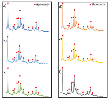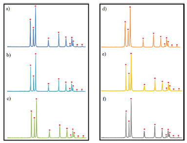 ![]() Figure 3. X-ray diffraction patterns for all samples. a) 100-1, b) 125-1, c) 150-1, d) 100-2, e) 125-2, f) 150-2