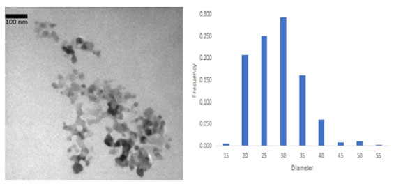 ![]() Figure 5. Micrographs of the zinc oxide and histogram of nanoparticles obtained for sample 100-2