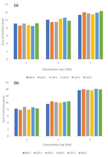 ![]() Figure 7. Inhibition zone (mm) of the ZnoNPs in-situ against all tested bacterial strains for a) E. coli b) S. aureus