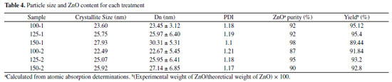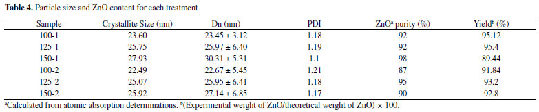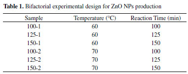 EXPERIMENTAL The following chemical substances were used: Hexahydrate zinc nitrate (Zn(NO3)2·6H2O) 98% pure, Ammonium carbonate ((NH4)2CO3), 99.99% pure, Acetone (CH3COCH3) 99.5% pure from Sigma-Aldrich, were used as received, and de-ionized and triple-distilled water with conductivity smaller than 6 μS cm-1. The synthesis of the ZnO NPs was carried out in a pair of replicas using the bifactorial experimentation. The corresponding design is shown in Table 1. A 24% w/w solution of ammonium carbonate was added as precipitating agent (pH=7.62). The reaction was carried out by addition of 75 mL of 0.90 mol L-1 zinc nitrate solution (pH=4.43). This solution was used as a precursor agent for the ZnO NPs. The reactive system consists in a magnetically stirred 250 mL three-necked flask with controlled temperature into a range of 60 to 70 °C. Then, ammonium carbonate solution, was dosed as reductor agent of the zinc oxide nanoparticles. This process was performed at different feeding rates, i.e., 0.27, 0.22 and 0.18 g min-1, this with the aim of to give total feeding times of 100, 125, and 150 min respectively. After periods, the reacting system was left to stand for 30 min at the same reaction temperature. The molar ammonium carbonate/zinc nitrate ratio was 10% higher than the stoichiometric ratio; the final pH was 5.5.