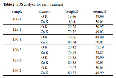 RESULTS AND DISCUSSION EDS Analysis To verify the presence and purity of the material obtained, the technique SEM-EDS was used. For instance, Figure 1 shows a Photograph from SEM of sample 100-2 described in Table 1, on which agglomerated particles can be seen. A specific area from the observed surface was selected to apply EDS analysis, obtaining components and composition from it. The EDS spectrum is shown in Figure 2 where signals for zinc and oxygen representative of the ZnO were found. The presence of carbon can be attributed to carbon adhesive tape. All samples were analyzed following the same methodology and similar results were obtained in all cases, where intense signals are observed at 1 and 8.7 keV confirming the presence of ZnO. Table 2 shows the EDS analysis of all the samples studied, where we can highlight that the atomic percentage for Zn and O is one by one, which is why it is concluded that the material obtained is ZnO.