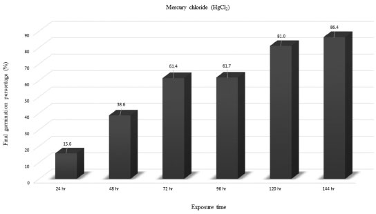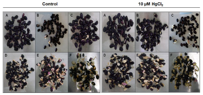 ![]() Figure 1. Effects of HgCl2 on the germination rates of Phaseolus vulgaris L. Beans seeds were subjected to 10 µmol L-1 solutions. The seeds were washed and germinated in a sprout machine for 144 hours