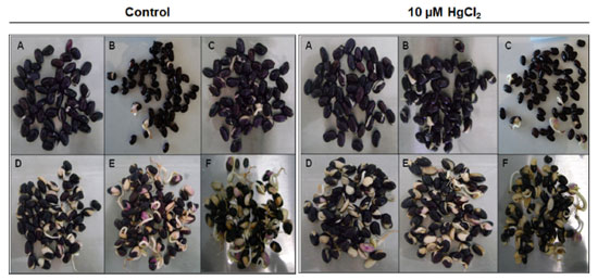 ![]() Figure 2. Development of Phaseolus vulgaris L. seedlings of the control samples (A) and HgCl2 samples (B) at different germination times and different exposure time: A (24 h); B (48 h); C (72 h); D (96 h); E (120 h) and F (144 h)
