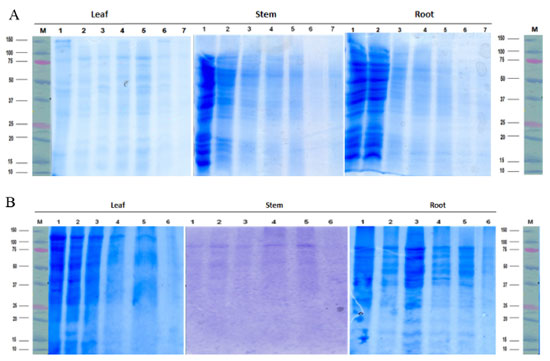 ![]() Figure 3. Electrophoretic profiles of the tissues of the bean seedlings of the control samples (A) and HgCl2 samples (B) at different germination times. Lanes: M-Molecular weight standards; 1 (0 h); 2 (24 h); 3 (48 h); 4 (72 h); 5 (96 h); 6 (120 h); 7 (144 h)