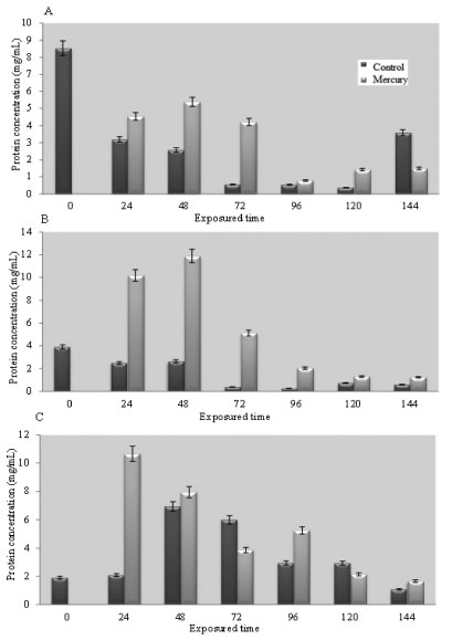 ![]() Figure 4. Concentrations obtained from leaf (A), stem (B) and root (C) extracts of bean seedlings from control samples and those exposed to mercury chloride (HgCl2) at a concentration of 10 µmol L-1 at different germination times (0-144 h)