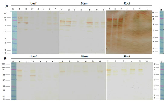 ![]() Figure 5. Western blot analysis of tissues of the bean seedlings of the control samples (A) and HgCl2 samples (B) at different germination times. Lanes: M-Molecular weight standards; 1 (0 h); 2 (24 h); 3 (48 h); 4 (72 h); 5 (96 h); 6 (120 h); 7 (144 h)