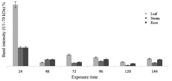 Expression profiling of U1-70 kDa According to western blotting analysis, the recognition of the U1 peptide of 70 kDa, antibodies detected band at position molecular weight predicted Figure 3. According to western blotting analysis, the protein were uniformly expressed in all samples constitutively. The variation in the recognition pattern of the U1-70 kDa peptide in leaf, stem tissues is evident and root at different exposure times. It should be noted that a batch of signal bands was detected at a higher molecular weight (>70 kDa) position, implicating that a protein ubiquitination phenomena might have been detected. The U1-70 kDa protein was expressed at a lower level in the stem compared to control, but at a higher level in other tissues (leaf and root) Figure 3 and 4. Quantification of densitometric data The majority of studies of peptide U1-70 kDa in plants have been at the level of the expression of recombinant proteins or mRNA in adult plants. In this study, when plants were subjected to mercury stress, we observed the accumulation of U1-70 kDa Figure 4, 5. These results have shown that U1-70 kDa is conserved in seeds and plays an important function in response to plant stress and its tissue-specific accumulation was observed Figure 6. This could indicate that U1 70 kDa plays an important function most likely during the early stages of seed germination.
