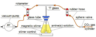 Since there is no analytical standard for AMP and PZ carbamates, we prepared these samples as already reported in our past work.9 These standard samples consisted of the samples 20 to 26 from Table 1 prepared gravimetrically. Each aqueous amine solution was constantly stirred and bubbled with an equal volume rate of air and CO2 at atmospheric pressure, as shown in Figure 1.