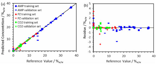 Figure 4 (a) compares the concentration predicted by the PLS model and the titration reference value. The residues are shown in Figure 4 (b) and seem random. Since the titration does not distinguish the CO2 absorbed into its different chemical forms, we only present in Figure 4 the amines and total CO2 concentration.
