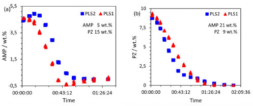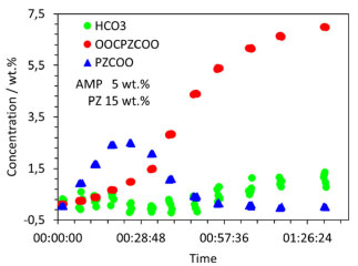 Figure 5 shows the prediction of the mono- and dicarbamate of PZ and bicarbonate in the 5 wt.% AMP 15 wt.% PZ blend during the carbonation process. At the beginning of the reaction, there was a rapid formation of PZCOO- which then reaches a maximum concentration. At the same time, monocarbamate is transforming into -OOCPZCOO- at a lower rate and rapidly after the monocarbamate reaches the maximum concentration. This faster dicarbamate formation is associated with the total consumption of free PZ. Although the -OOCPZCOO- prediction is not reliable, this profile agreed with published works.9,23,24