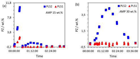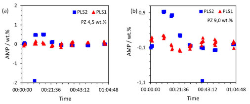 ![]() Figure 7. AMP prediction comparison between PLS and PLS2 models in PZ solutions