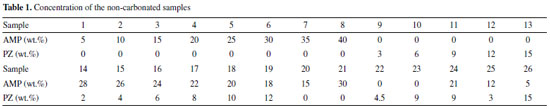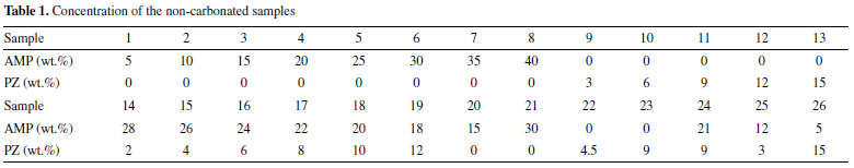MATERIALS AND METHOD Samples All the calibration curves standard samples were prepared gravimetrically on an analytical scale model AY220, Shimadzu. AMP (Sigma Aldrich), PZ (Sigma Aldrich), distilled water, and CO2 (99.9%, Air Liquide Brasil) were the reagents used. The non-carbonated samples were: eight aqueous AMP solutions ranging from 5 to 40 wt.%; five aqueous PZ solutions from 3 to 15 wt.%; and six AMP-PZ blends, as shown in Table 1.