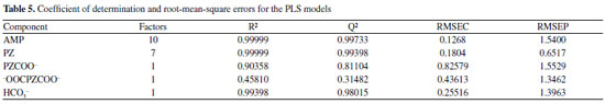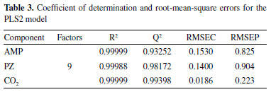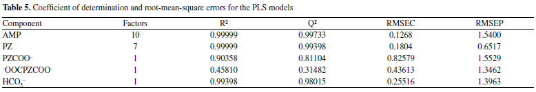 Samples The titration in triplicate of all samples is on the supplementary material. Comparing the weighed mass and the titration concentration allowed us to predict the AMP and PZ purities as 91±1% and 98±1%, respectively. The titration standard deviation error was 0.08 wt.%. PLS2 model We already developed a single PLS2 model to predict AMP, PZ, and CO2 absorbed in all its chemical forms (i.e., carbamates and carbonates).9 This model was obtained with a single-window at 1690-846 cm-1 without any pretreatment using 8 factors.10 Altogether, 568 spectra samples had their concentration predicted with relative errors lower than 10% and 93% of the variance of the samples represented. Although the data variance could be well reproduced (R2 > 0.999 and Q2 > 0.9), as shown in Table 3, it had a drawback in predicting the PZ concentration in some of the CO2 saturated solutions. This probably happens due to the PZ peak at 1326 cm-1 that gets overlapped by the PZ carbamates formation.9 Table 3 shows the training coefficient of determination (R2), the validation coefficient of determination (Q2), the root-mean-square error of calibration (RMSEC), and the root-mean-square error of prediction (RMSEP).
