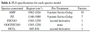 PLS models We developed one PLS model for each chemical component identified in the liquid phase: AMP, PZ, HCO3-, PZCOO-, and -OOCPZCOO-.9 The models' specifications are shown in Table 4. The region in 1303-836 cm-1 contained all the information used in all models, meaning we could gather more information with less data than the PLS2 model. Figure 3 shows the regions used in the model.