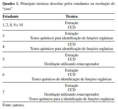 METODOLOGIA Ao desenvolver este trabalho procuramos inserir, em uma disciplina experimental, uma atividade que tivesse potencial para envolver mais o estudante e para que ele pudesse usar sua criatividade na resolução de um "caso" e, com isso, criar um ambiente propício para que ele percebesse a importância/utilidade das técnicas estudadas ao longo da disciplina e a relação delas com o seu campo de trabalho futuro. Acreditamos que a resolução de um caso fictício traz para a sala de aula uma forma não convencional de aprendizagem e auxilia no desenvolvimento de habilidades. A estratégia de utilização de "casos" foi empregada em uma turma de 13 estudantes na disciplina "Química Orgânica Experimental F", que integra o currículo do curso de Farmácia da UFMG. A disciplina, com 60 horas, é ministrada a estudantes do período diurno que já cursaram a disciplina Química Orgânica I e que, idealmente, estejam no quarto período do curso e cursando a disciplina Química Orgânica II. A disciplina "Química Orgânica Experimental" é dividida, quanto ao conteúdo ministrado, em dois blocos. O primeiro bloco contempla seis aulas práticas que envolvem técnicas básicas frequentemente utilizadas em laboratórios de Química Orgânica, a saber: cromatografia em camada delgada, cromatografia em coluna, extração sólido-líquido e líquido-líquido, destilação simples, destilação fracionada e destilação por arraste a vapor. No segundo bloco há um conjunto de aulas nas quais são realizadas reações orgânicas e isolamento de produtos que fazem parte de uma mesma rota sintética para a obtenção de corantes azoicos de interesse industrial. Após cada aula do primeiro bloco foi proposto aos estudantes a resolução de um caso fictício no qual estariam envolvidos conceitos e técnicas abordadas nas aulas, em substituição ao relatório de aulas práticas que tradicionalmente é feito nas disciplinas de caráter prático. Esses "casos" foram entregues ao final da aula prática, via Moodle, e os estudantes tiveram o prazo de sete dias para resolvê-los. Foi recomendado aos estudantes que buscassem informações em outras fontes que não o material utilizado nas aulas e também que discutissem os "casos" com colegas e professores. Embora pudessem discutir o "caso" entre si, a resolução deveria ser entregue individualmente. Com a atividade o estudante poderia acumular até seis pontos (um por "caso" resolvido) de um total de cem pontos da disciplina. Para aferir essa pontuação, o desempenho na atividade foi avaliado considerando-se a plausibilidade das hipóteses apresentadas em sua resolução, ainda que a resposta apresentada para cada "caso" não correspondesse completamente à resposta esperada. A estratégia de uso de "casos" teve a intenção de auxiliar os estudantes na compreensão das técnicas usadas durante as aulas e estimular o interesse em torno delas, uma vez que eles poderiam, facilmente, associar a técnica ao seu campo de trabalho futuro. Esses "casos" consistiram em breves histórias nas quais um dos personagens precisava executar uma tarefa para desvendar o que havia acontecido na história e, para isso, o uso de técnicas abordadas em aula seria fundamental. O leitor - o estudante da disciplina - era, ao final da história, convidado a participar do enredo, atuando como o laboratorista responsável pela investigação. A resolução dos "casos" ou histórias, que usaram uma linguagem narrativa, tende a provocar novos insights e conversas, permeados pelo conhecimento/uso de técnicas de laboratório. Para cada um dos "casos" foi incluído um apêndice no qual constava uma lista de vidrarias, reagentes e equipamentos disponíveis em um laboratório fictício e, por vezes, alguns resultados experimentais obtidos por algum personagem, simulando uma situação na qual os recursos para a resolução do problema fossem apenas aqueles disponíveis na lista, embora nem todos precisassem ser utilizados, assemelhando-se a uma situação real. Para este trabalho escolhemos o "caso 3", proposto após a aula que tratava da extração de cafeína do pó de guaraná. Nessa aula, os estudantes fizeram a extração da cafeína de uma amostra de guaraná em pó usando duas técnicas: a) extração sólido-líquido, feita pela adição de água quente à amostra (pó de guaraná); extração da cafeína, então presente na água, com CHCl3; e evaporação do solvente com o auxílio de um rotaevaporador, para a obtenção da cafeína como um sólido branco; b) cromatografia em camada delgada, usando o sólido obtido no processo anterior e comparando o resultado com um padrão de cafeína. Essas técnicas são frequentemente utilizadas em laboratório de Química Orgânica para a obtenção e purificação de compostos orgânicos, incluindo compostos de interesse farmacológico. O estudo dessas técnicas faz parte da formação acadêmica de químicos e farmacêuticos, sendo especialmente relevante para profissionais que atuam na indústria de Química Fina e em laboratórios de análise forense. Para construir o "caso" a ser solucionado pelos estudantes foram usados elementos relacionados ao campo da Farmácia, com a intenção de estimular o interesse dos estudantes pela atividade e auxiliá-los a estabelecer relações entre o conteúdo desenvolvido nas aulas de Química Orgânica Experimental e a atividade futura. Assim, essa narrativa, apesar de ser inserida posteriormente ao estudo das técnicas de extração e de CCD, poderia agir como ponto de partida para orientar os estudantes na busca por informações úteis ou até mesmo imprescindíveis para a resolução do "caso", de modo a propiciar-lhes contato com temas abordados em outras disciplinas do curso, algumas ainda a serem cursadas em períodos posteriores. A possibilidade de intoxicação e/ou envenenamento presente na narrativa levaria o estudante às hipóteses de substâncias potencialmente tóxicas e aos p