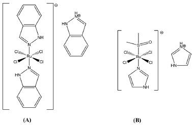 ![]() Figura 1. Estrutura química dos complexos de Ru3+: (A) KP-1019 e (B) NAMI-A. Fonte: Leijen et al.9