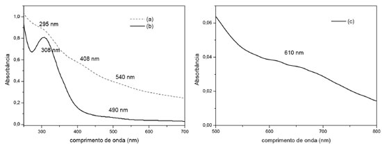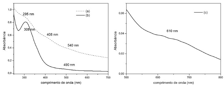 ![]() Figura 2. Espectros de absorção eletrônica do cloreto de Ru3+- RuCl3 (a), complexo Ru-Mal (b) e a ampliação na região de 500-800 nm do complexo Ru-Mal (c)