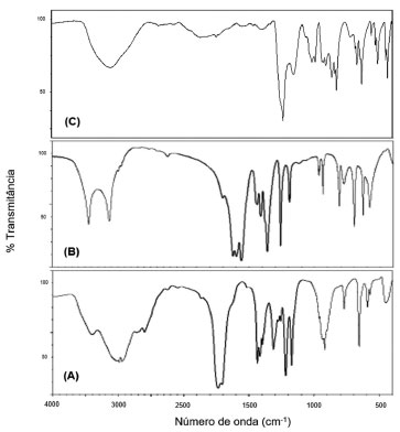 ![]() Figura 3. Espectros no infravermelho do ácido malônico (A), malonato de sódio (B) e complexo Ru-Mal (C), realizados em pastilha de KBr