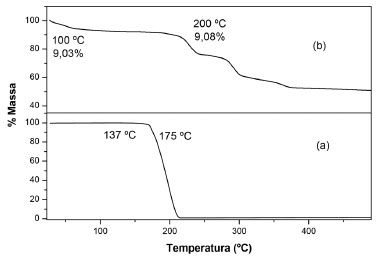 ![]() Figura 4. Curvas de TG do ácido malônico (a) e do complexo Ru-Mal (b)