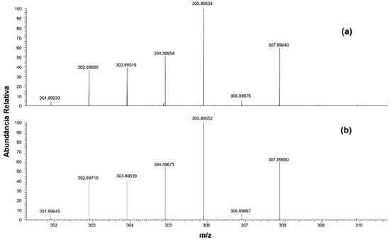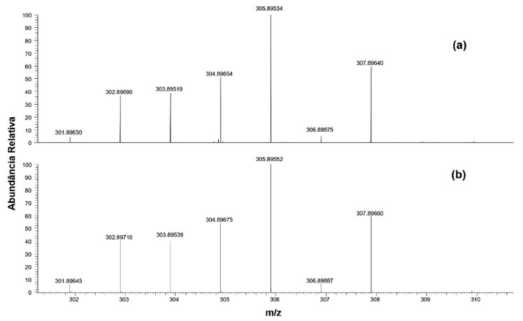 A curva de TG do ácido malônico encontra-se em concordância com os dados apresentados pelos padrões da literatura, onde destaca-se a presença de um único evento térmico com a temperatura de onset em 137 ºC e temperatura de decomposição em 175 ºC.21 Através da curva de TG do complexo Ru-Mal é possível observar diferenças significativas do comportamento térmico das amostras, sugerindo para este caso uma maior estabilidade térmica do ácido malônico quando ligado/coordenado ao íon Ru3+. Na curva de TG do complexo Ru-Mal observa-se a presença de um evento térmico em 100 ºC, referente a perda de duas moléculas de água de hidratação na estrutura do complexo. Em 200 ºC observa-se um evento térmico com perda de massa de 9,08%, referente a duas moléculas de água coordenadas, sugerindo que a presença da banda larga observada no espectro de infravermelho em 3412 cm-1 se refere a estiramentos OH de águas coordenadas ao centro metálico. É observada uma perda de massa total até 500 ºC, resultando em espécies óxido, como Ru2O3 e Na2O, uma vez que o gás de arraste não apresenta capacidade de promover redução ou oxidação do rutênio. Na Figura 5 são apresentados os espectros de massas do complexo Ru-Mal, experimental (a) e teórico (b). Através do espectro de massas experimental é possível observar uma massa com maior abundância relativa correspondente a m/z 305,89534. Essa relação m/z corresponde ao complexo Ru-Mal após a perda de duas moléculas de H2O de coordenação, m/z = 305,89534, com erro de 0,58 ppm (Figura 6). Essa perda de água ocorreu devido à alta temperatura do capilar (320 ºC) na qual o spray com a solução do analito passa.