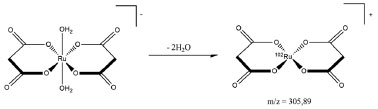 ![]() Figura 6. Equação representativa do processo de ionização do complexo Ru-Mal (conformação cis), com a geração do íon molecular com maior abundância relativa observada (m/z = 305,89)