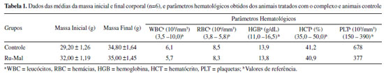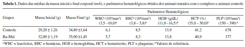 Os valores de leucócitos (WBC), hemoglobina (HGB) e hematócrito (HCT) dos animais do grupo tratado com Ru-Mal apresentaram valores dentro do padrão de referência, assim como o grupo controle, o que indica que o sistema hematopoiético não foi afetado. A maioria dos antineoplásicos convencionais causam mielossupressão, o que não ocorreu com o uso de Ru-Mal. Os valores de plaquetas dos animais tratados com Ru-Mal também estão dentro do padrão de referência. Para a avaliação da atividade antitumoral foram utilizadas 1 mg/kg de cisplatina no grupo controle positivo, dosagem utilizada para esse fármaco devido à alta toxicidade; e 5 mg/kg do complexo Ru-Mal, durante 7(sete) dias de tratamento quimioterápico. Salienta-se que as doses utilizadas para o ensaio foram calculadas mediante os ensaios de toxicidade aguda, como preconizado pelos protocolos de testes pré-clínicos. Durante todo o teste de atividade antitumoral não foram observados óbitos nos grupos (controle negativo - soro fisiológico, controle positivo - cisplatina, e complexo Ru-Mal). Em uma análise dos animais observaram-se algumas alterações como piloereção e queda de pelo para o grupo tratado com cisplatina. Para o grupo de animais tratados com o complexo Ru-Mal, não foi observada nenhuma alteração comportamental. Durante o período de tratamento quimioterápico os animais foram avaliados quanto à alimentação, ingestão hídrica e ganho de massa corpórea. Para os animais tratados com o complexo Ru-Mal o ganho de massa corpórea, não associado à massa tumoral, foi de cerca de 10% no grupo, já no caso do grupo tratado com a cisplatina houve uma diminuição da massa corpórea nos animais (5%), sugerindo que os efeitos colaterais e toxicidade do complexo são menores quando comparados à cisplatina. Com relação à ingestão hídrica, todos os grupos de animais se mantiveram em índices normais. Os dados obtidos após os testes de atividade antitumoral estão sumarizados na Tabela 2.