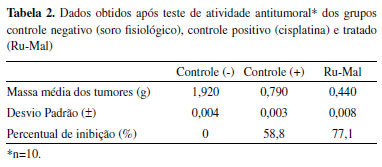O composto Ru-Mal apresentou um maior percentual de inibição tumoral (~77%) quando comparado ao quimioterápico comercializado, que é a cisplatina, frente ao carcinoma de Ehrlich, porém salienta-se que a dose utilizada para o complexo Ru-Mal foi cerca de 4 vezes maior, em decorrência da sua baixa toxicidade aguda. Os dados apresentados para o padrão comprovam a confiabilidade do ensaio proposto, uma vez que para essa linhagem celular implantada, a cisplatina apresenta percentual de inibição tumoral próxima de 58%.