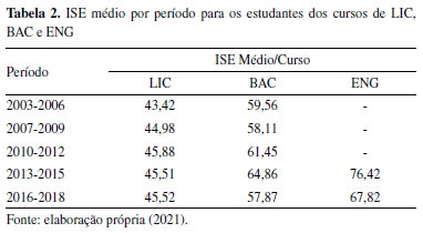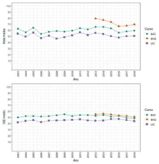 ![]() Figura 1. O gráfico superior indica a média na prova do vestibular da UNESP, por ano, obtida pelos alunos dos cursos de bacharelado (BAC) e licenciatura (LIC) em Química e Engenharia Química (ENG). O gráfico inferior mostra o ISE médio, por ano, dos mesmos alunos. Fonte: elaboração própria (2021), com base nos dados da VUNESP