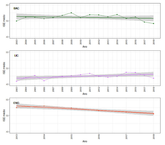 ![]() Figura 2. Linhas de tendência de variação do ISE médio dos alunos. Fonte: elaboração própria (2021)