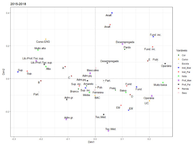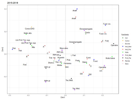 Observando os dados da Tabela 2, notamos que o valor médio do ISE no último período, de 2016 a 2018, é praticamente o mesmo do período anterior no caso da LIC e muito abaixo no caso do BAC e da ENG. Inclusive, o valor do ISE do último período do BAC é o mais baixo entre todos os períodos. Importante notar que mesmo o ISE/médio mais baixo da ENG não equivale ao ISE/médio mais alto do BAC. Logo, os últimos três anos marcam mudanças do perfil dos alunos, sobretudo do BAC. Diante disso, questionamos quais variáveis foram responsáveis pelas variações indicadas anteriormente? Essa pergunta pode ser respondida por meio da ACM. A Figura 3 apresenta a ACM para o último período da série histórica, dessa forma, é possível comparar os perfis dos estudantes de cada um dos cursos de Química da instituição. A interpretação do mapa obtido a partir da ACM é relativamente simples. Quanto mais próximas do mapa duas categorias estiverem, maior é a associação entre elas; quanto mais afastadas, maior a antiassociação. Além disso, as categorias mais afastadas da origem do mapa são as de maior contribuição para cada eixo, quer dizer, quanto mais afastadas da origem elas estiverem, mais significativa é a categoria dentro do conjunto de variáveis. Portanto, a interpretação do efeito das categorias mais próximas da origem deve ser relativizada.