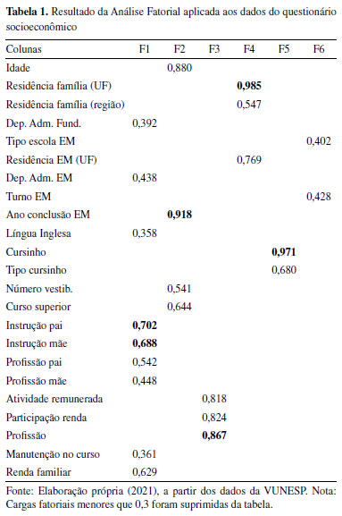 COLETA E ANÁLISE DE DADOS Os dados da pesquisa foram fornecidos pela Fundação para o Vestibular da Universidade Estadual Paulista (VUNESP). Eles correspondem às respostas do questionário socioeconômico de 29 itens, preenchido no momento da inscrição, e a nota média obtida no exame de seleção dos cursos de LIC, BAC e ENG da UNESP, campus de Araraquara. A nota média dos candidatos no exame de seleção, fornecida pela VUNESP e utilizada no presente estudo, é baseada apenas no número de acertos nas provas objetivas e na nota da redação. Existem estudos que discutem alternativas socialmente mais justas para o cálculo das médias dos estudantes em exames de seleção para ingresso no ES.9 Para o estudo longitudinal analisamos o intervalo entre 2003 e 2018, período no qual as perguntas do questionário não se alteraram. Os dados referentes ao curso de ENG iniciam apenas em 2013 que é ano do primeiro vestibular. Nossa amostra resultou em 1544 respondentes, representando todos os ingressantes desses cursos ao longo desses anos. Constituímos os dados sobre a origem social dos alunos, em consonância com a literatura sociológica bourdiana, entendendo que ela deve ir além de informações econômicas, como renda familiar média.12 No Programme for International Student Assessment (PISA), por exemplo, o status socioeconômico dos alunos é definido por diversos itens relacionados com o background familiar, como a formação e ocupação dos pais e o acesso a bens materiais e culturais. Souza30 também é enfático na defesa de que um estudo sociológico no contexto brasileiro não deve se limitar à renda como indicador do pertencimento de classe e das suas consequências escolares e profissionais. Portanto, se temos a ideia de construir um índice dessa natureza para os alunos da UNESP, precisamos definir quais itens do questionário levaremos em consideração para abarcar elementos econômicos, culturais e, se possível, sociais. A renda familiar, a instrução e a ocupação dos pais foram adotadas como indicadores de capitais culturais, econômicos e sociais, com base no questionário da VUNESP, por outros autores.19,31,32 Contudo, optamos por definir estatisticamente um Índice Socioeconômico (ISE) para os alunos. Para isso, realizamos uma Análise Fatorial (AF) por meio do modelo da análise de componentes principais,33 para identificar os itens do questionário mais associados aos capitais bourdianos, e posteriormente utilizamos o Modelo de Resposta Gradual da Teoria da Resposta ao Item34,35 para construção do ISE. Todas as análises foram realizadas no ambiente de programação Rstudio.36 A AF permite agrupar e reduzir os itens do questionário a menos variáveis (ou fatores): os traços latentes.33 Cada um dos novos fatores pode ser interpretado a partir dos itens aos quais se relaciona. O número de fatores é sempre dependente das respostas atribuídas ao instrumento. Em nosso caso, o número de seis fatores foi o que mais se ajustou aos dados.