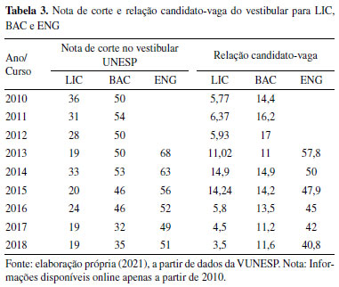 Analisando a ACM apresentada na Figura 3, nota-se que os alunos da LIC e da ENG aparecem em posições opostas, indicando perfis completamente anti associados. Os alunos da ENG estão mais associados com pais com ensino superior completo (Sup.); rendas mais altas (A e B); pais profissionais liberais, professores ou técnicos de ensino superior (Lib./Prof./Tec. sup.) e alto desempenho no vestibular (Muito Alta e Alta). Já os ingressantes na LIC estão associados com pais de ensino fundamental completo e médio completo (Fund. e EM); renda familiar baixa (D); mães em profissões sem exigência de mão de obra especializada (Operária), estudantes autodeclarados pretos (Preto) e com baixos desempenhos no vestibular (Muito baixa e Baixa). Reconhecemos a importância de discussões que abordem questões étnico-raciais e que avaliem o impacto das cotas raciais na diminuição das desigualdades de acesso ao ES, no entanto, nossos dados não permitem fazer tais inferências. O que podemos perceber é que esse dado é um, dentre outras variáveis, que diferencia o perfil dos alunos dos cursos de química dessa instituição. Já os estudantes do BAC estão em uma posição intermediária na comparação com os ingressantes dos outros cursos. Eles se aproximam do perfil da ENG em algumas categorias e da LIC em outras. Destaca-se o fato dos alunos do BAC estarem bastante associados com pais com ensino superior incompleto (Sup. inc.); desempenho médio no vestibular (Média), estudantes brancos (Branco) e identificados como mulheres (Feminino). Há também um quarto perfil de estudante, mas que não se associa diretamente com nenhum curso, que são os ingressantes com pais analfabetos (Analf.) ou com ensino fundamental incompleto; sem emprego (Desempregado); com renda muito baixa (E) e autodeclarados pardos (E). Apesar de não estarem associados a nenhum curso diretamente, no entanto, há uma pequena associação de algumas dessas categorias com o perfil dos estudantes da LIC. Outro dado que aponta diferenças no público que busca a LIC, o BAC e a ENG é a relação candidato-vaga e a nota de corte, como observado na Tabela 3.